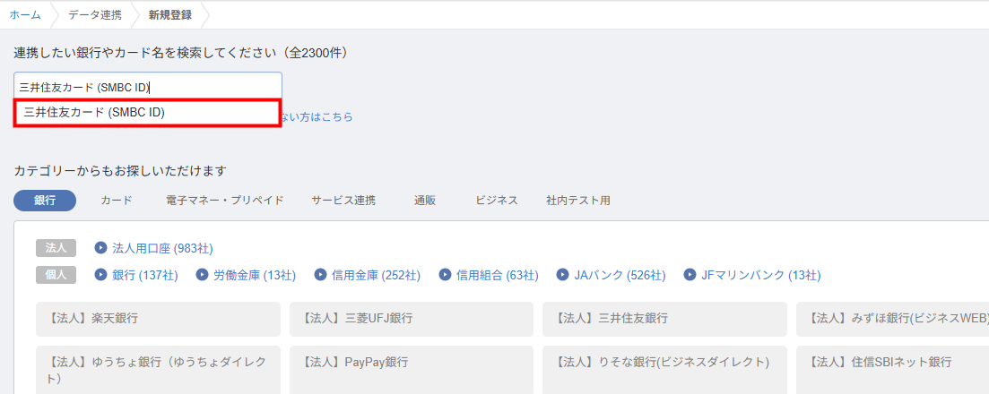 - 「データ連携」>「新規登録」画面左上の検索ボックスに「三井住友カード (SMBC ID)」と入力し、表示された該当のサービスを選択します。