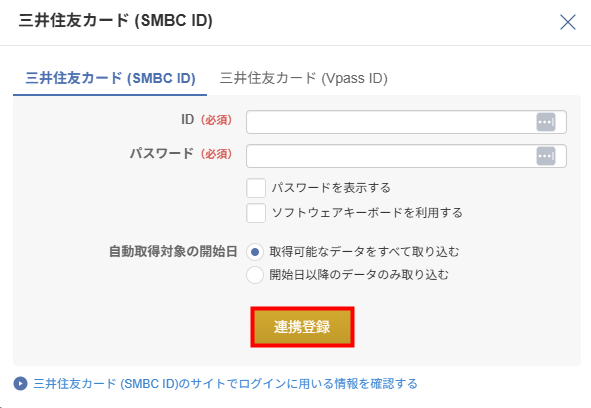 - 「三井住友カード (SMBC ID)」画面でアカウント情報を入力し、「連携登録」ボタンをクリックします。