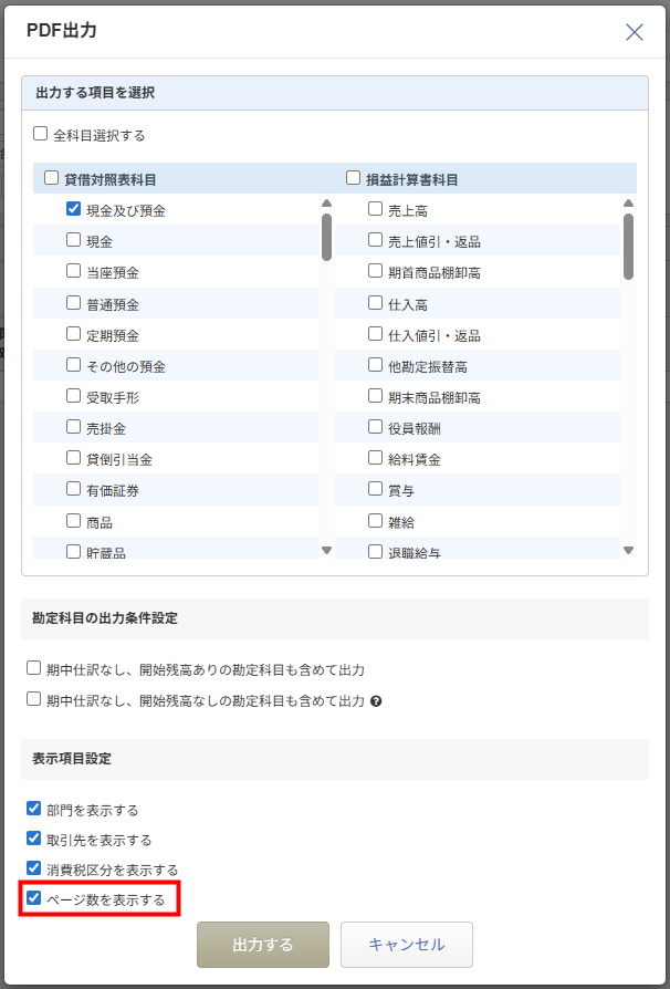 「現預金出納帳」「総勘定元帳」「補助元帳」の「PDF出力」画面に「ページ数を表示する」のチェックボックスを追加しました。