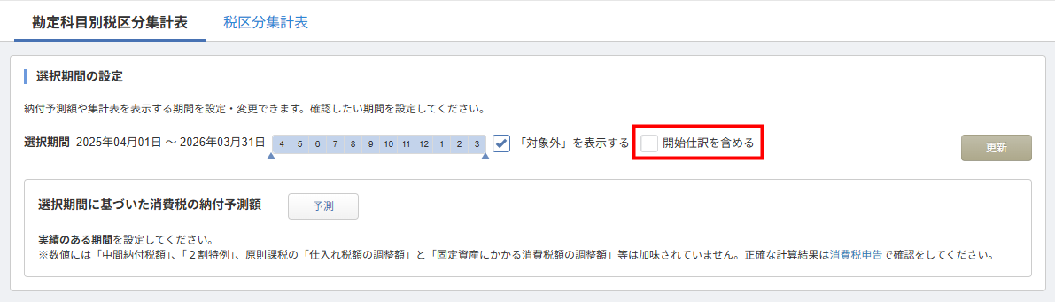これにより、「消費税集計」画面で集計時に開始仕訳を含めるかどうかを選択できるようになりました。