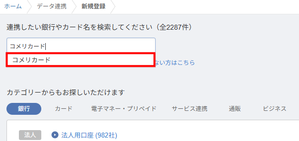 - 「データ連携」>「新規登録」画面左上の検索ボックスに「コメリカード」と入力し、表示された該当の連携サービスを選択します。