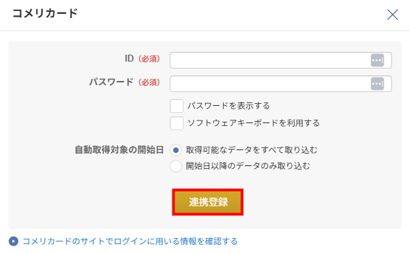 これにより、マネーフォワード クラウド会計・確定申告で、「コメリカード」の利用明細を取得できます。