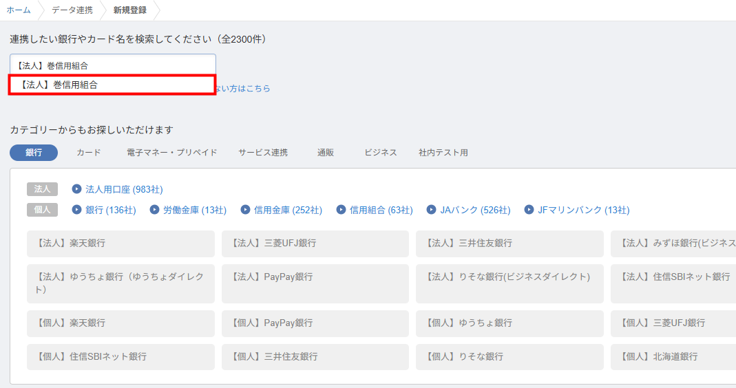 - 「データ連携」>「新規登録」画面左上の検索ボックスに「【法人】巻信用組合」と入力し、表示された該当の金融機関を選択します。