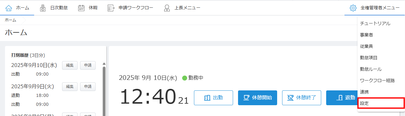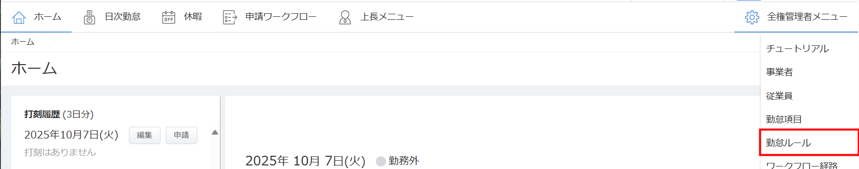 - 「全権管理者メニュー」にカーソルをあわせ、「勤怠ルール」をクリックします。
