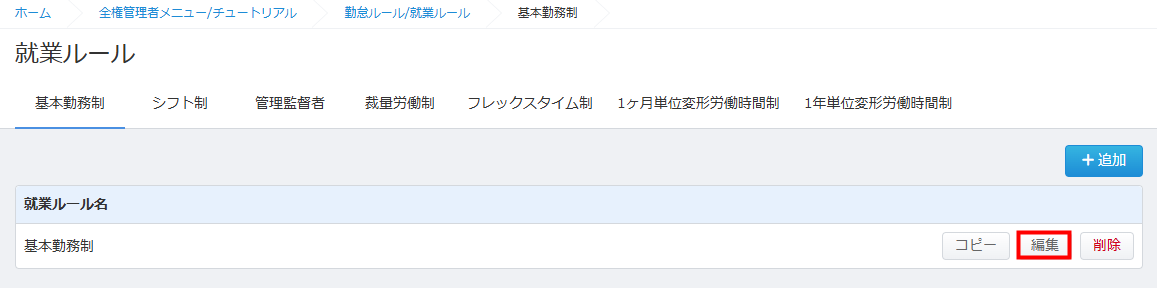 - 「就業ルール」画面で「基本勤務制」タブを選択し、設定する就業ルールの「編集」をクリックします。