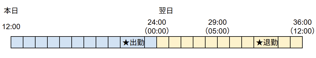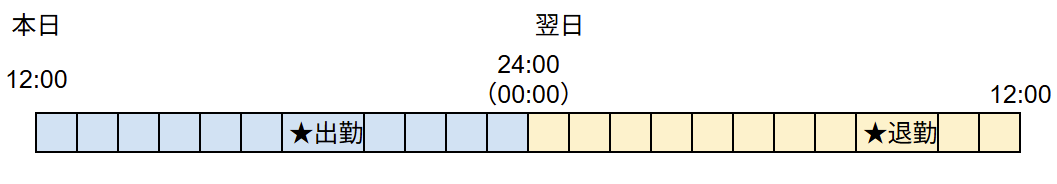 出勤打刻の翌日に退勤打刻を行った場合、出勤打刻から48時間以内であれば、出勤日と退勤日は同じ勤務日に反映します。