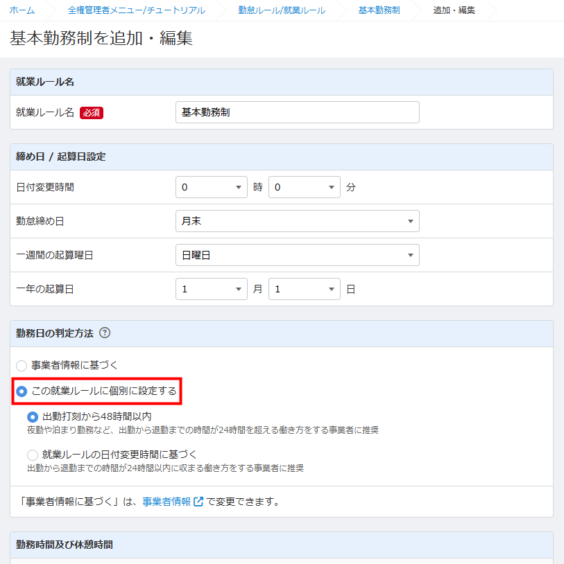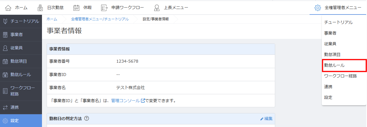 勤務日の判定方法は、事業者単位と就業ルール単位で設定できます。