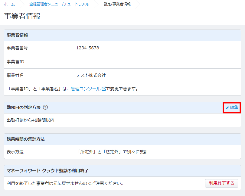 - 「事業者情報」画面の「勤務日の判定方法」で「編集」をクリックします。