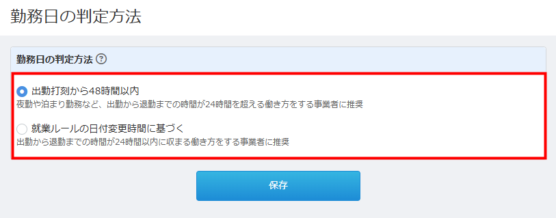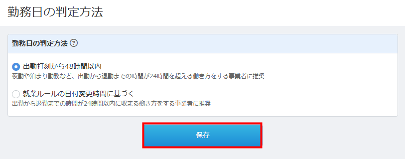 - 「出勤打刻から48時間以内」または「就業ルールの日付変更時間に基づく」を選択し、「保存」をクリックします。