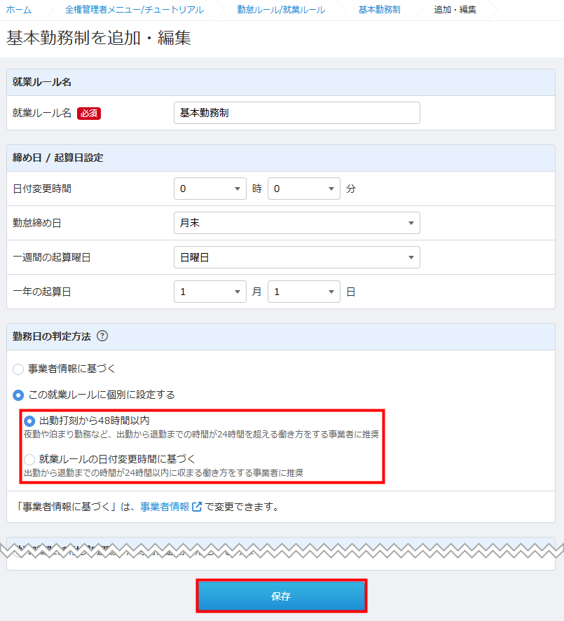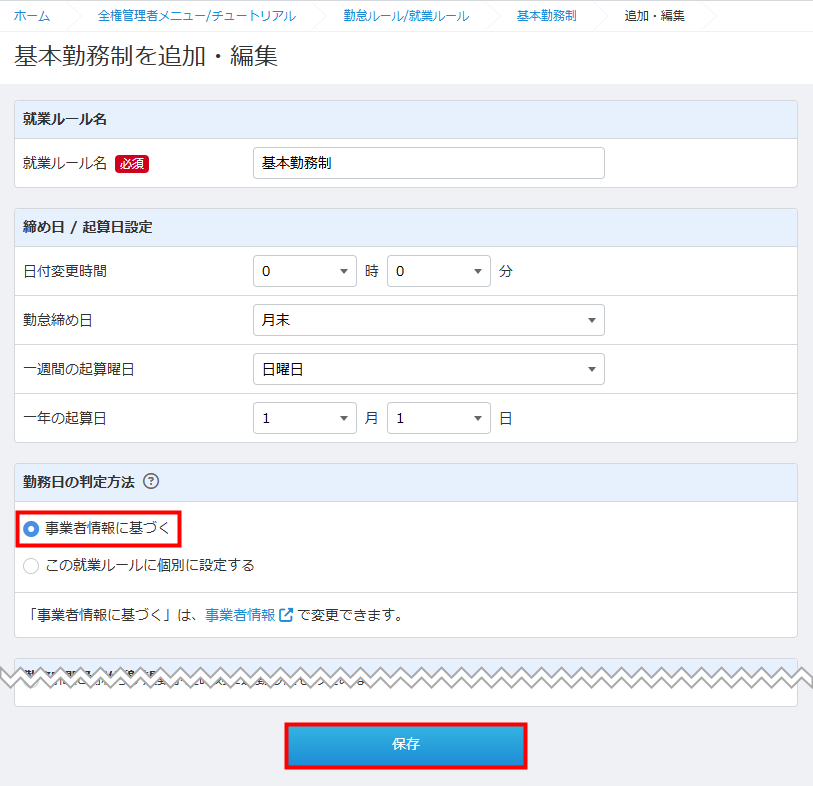 - 就業ルールの詳細画面にある「勤務日の判定方法」で「事業所設定に基づく」を選択し、「保存」をクリックします。