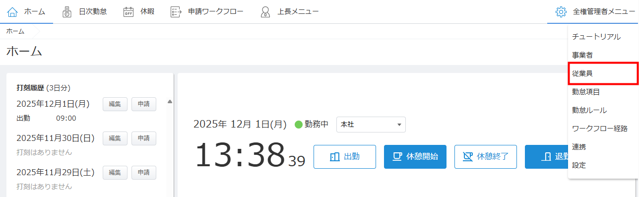 - 「全権管理者メニュー」にカーソルをあわせ、「従業員」を選択します。
