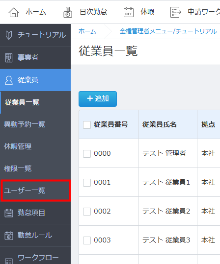 - 左のメニューの「ユーザー一覧」をクリックします。