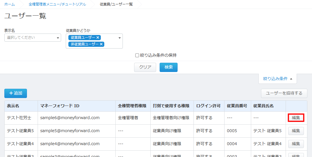 - 「従業員一覧」画面でログインを制限する従業員の「編集」をクリックします。