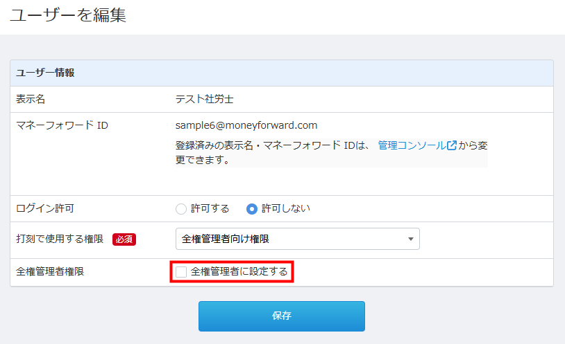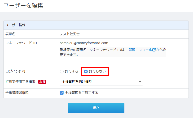 - 「ログイン許可」で「許可しない」を選択すると、保存時点からマネーフォワード クラウド勤怠にログインできなくなります。外部管理者がすべての操作を完了してから設定してください。