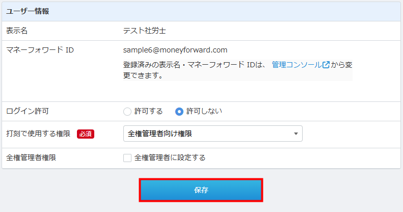 - 「ログイン許可」で「許可しない」を選択すると、保存時点からマネーフォワード クラウド勤怠へのログインや「マネーフォワード クラウドのマイページ」での打刻ができなくなります。従業員がすべての操作を完了してから設定してください。