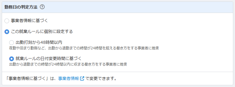 「勤務日の判定方法」では、出勤や退勤等の打刻がどの日に属するのかを判定する基準を設定します。