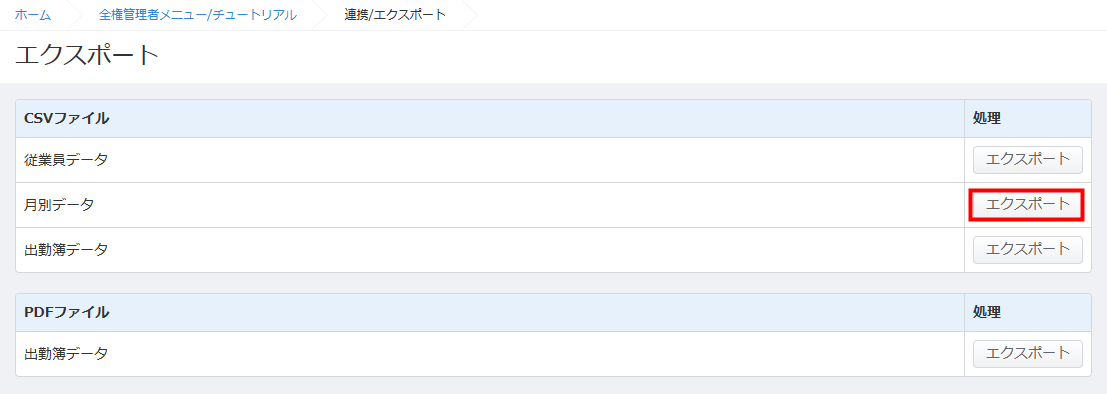 月別データは、「月別データ」画面の「エクスポート対象年月」で指定した月の締め日までのデータがエクスポートされます。