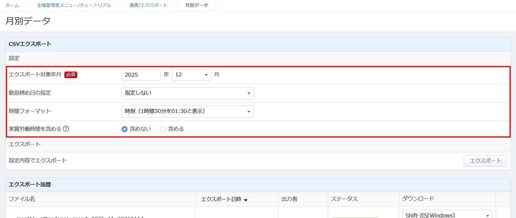 - 「月別データ」画面の「エクスポート対象年月」や「勤怠締め日の指定」など出力する条件を選択します。