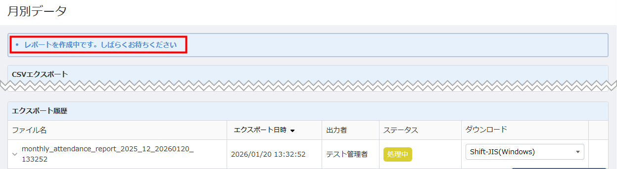 - 画面上部に「レポートを作成中です。しばらくお待ちください」というメッセージが表示されたことを確認します。