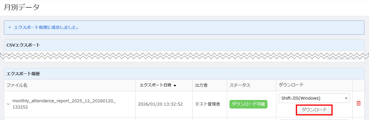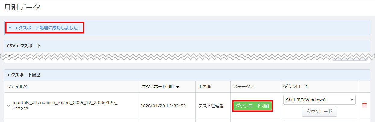 - 「月別データ」画面上部に「エクスポート処理に成功しました。」というメッセージが表示されたこと、または画面下部の「エクスポート履歴」欄でダウンロードするファイルのステータスが「ダウンロード可能」というメッセージが表示されたことを確認します。