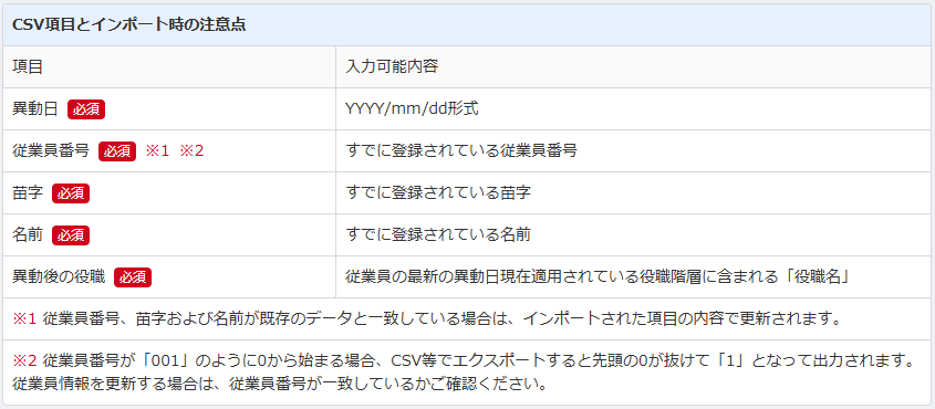 | ⑤ | 異動後の役職 | 必須項目です。 「役職階層」画面で異動日時点で適用される役職階層上に登録されている役職名と完全一致で入力します。 |