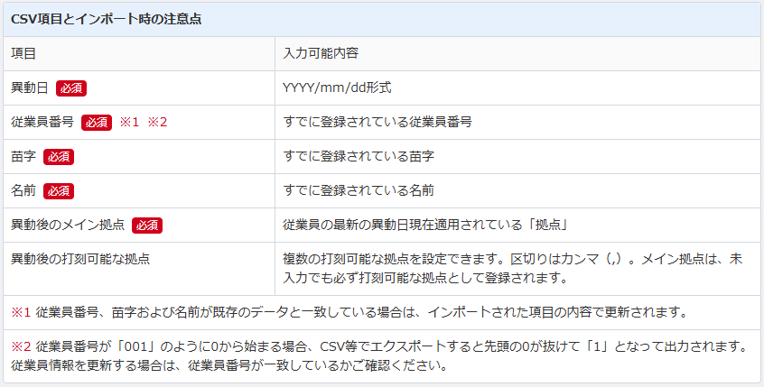 | ⑥ | 異動後の打刻可能な拠点 | 「拠点」画面に登録されている拠点名と完全一致で入力します。 打刻可能な拠点は複数の拠点を設定できます。複数の拠点を設定する場合は、拠点名をカンマ(,)で区切ってください。 異動後の打刻可能な拠点が空欄の場合、「異動後のメイン拠点」に入力した拠点と同じ拠点が設定されます。 |