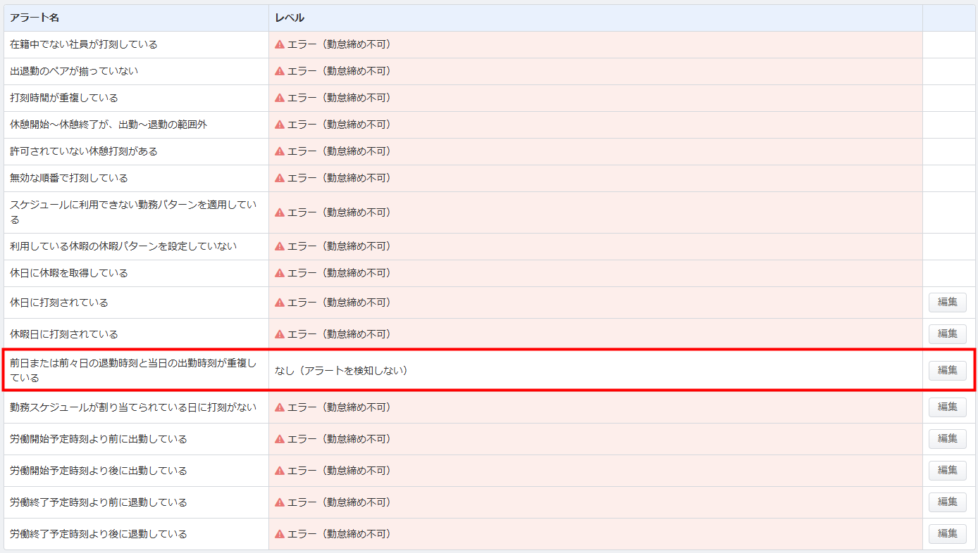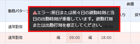 前日または前々日の退勤打刻と当日の出勤打刻で時間の重なりがある場合に、出勤打刻に対してアラートが表示されます。