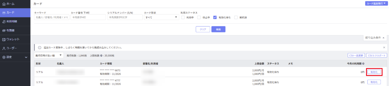 カードが手元に届いたら、マネーフォワード Pay for Businessにログインし、有効化操作を行ってください。