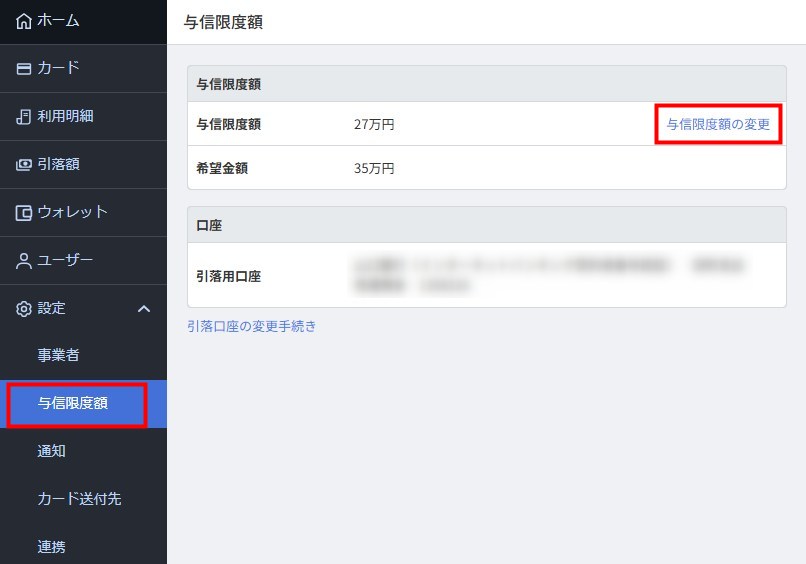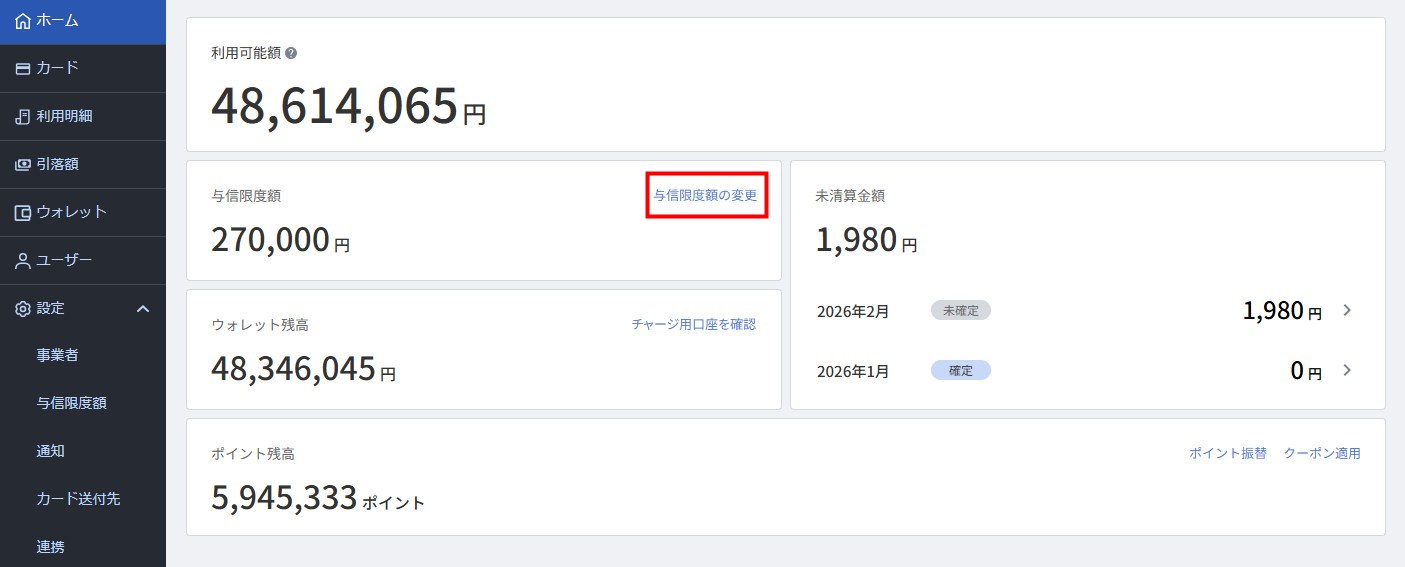 - 「ホーム」画面で「与信限度額」の右側にある「与信限度額の変更」をクリックします。