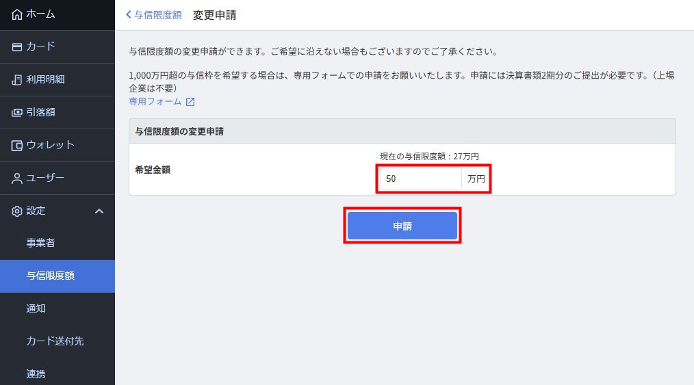 - 与信限度額は、「管理者」ロールのユーザーのみ引き上げ申請ができます。