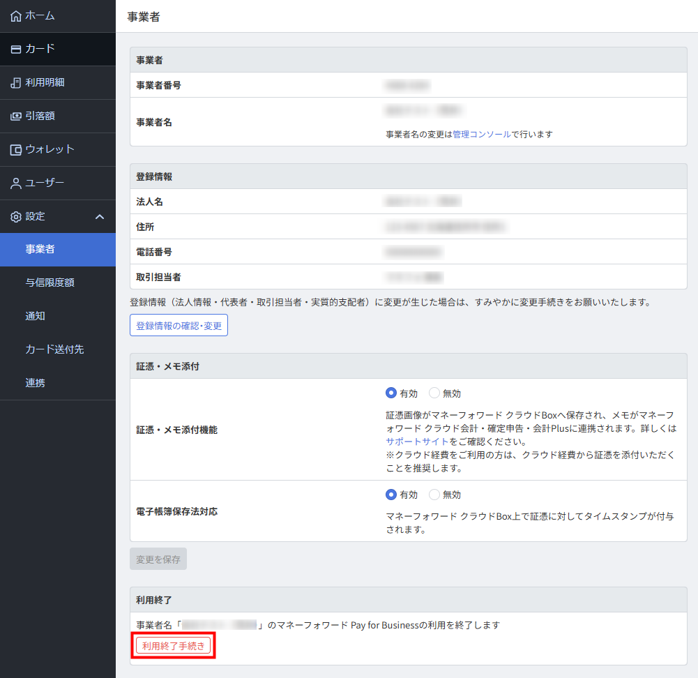 - 「設定」>「事業者」画面で「利用終了手続き」をクリックします。