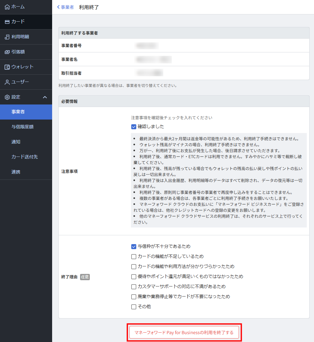 - 「利用終了」画面で「利用終了する事業者」と「必要情報」を確認し、問題がなければ「マネーフォワード Pay for Businessの利用を終了する」をクリックします。