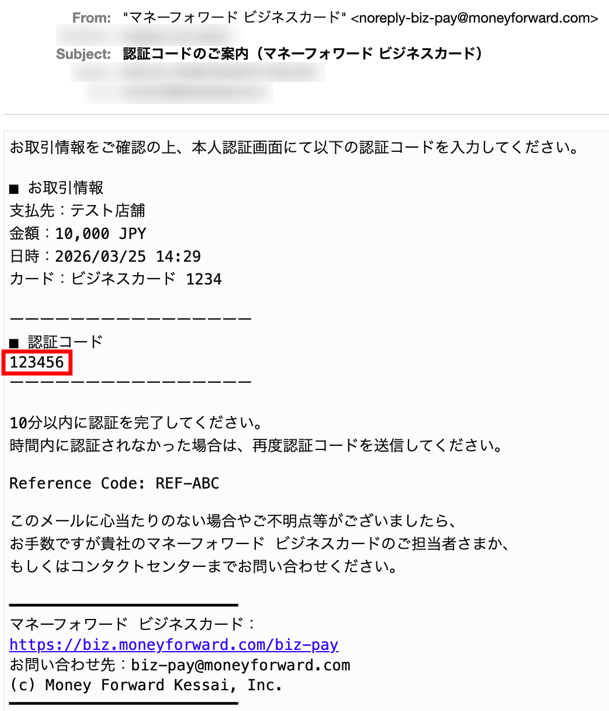 マネーフォワード ビジネスカードに登録しているメールアドレス宛に6桁の認証コードが送信されます。
