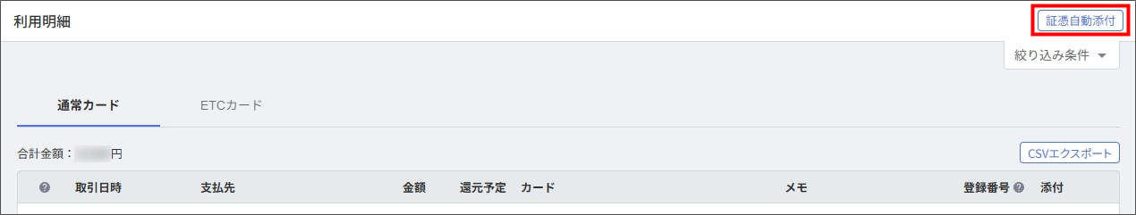 - 「利用明細」画面右上の「証憑自動添付」をクリックします。
