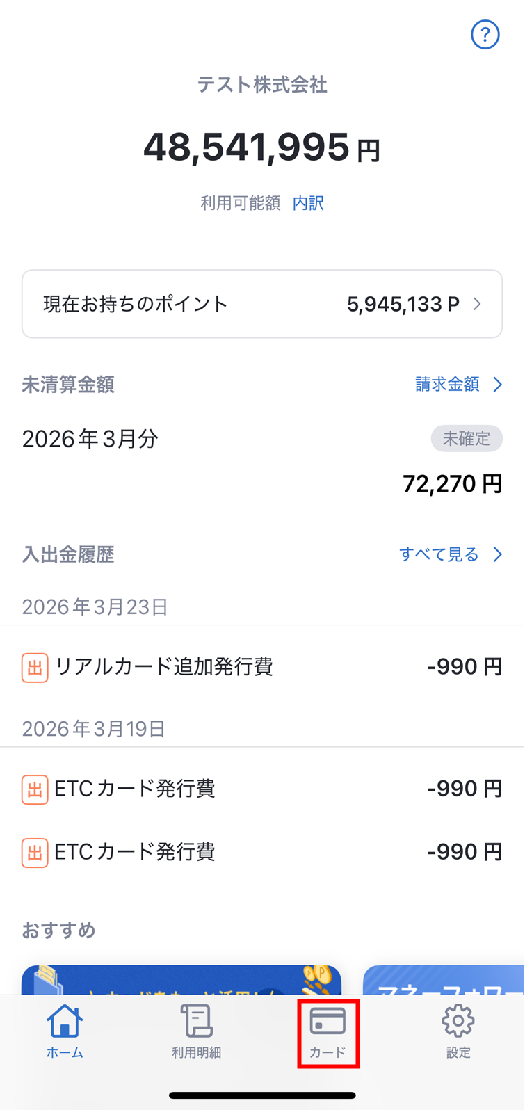 - マネーフォワード ビジネスカードアプリにログインし、画面下の「カード」をタップします。