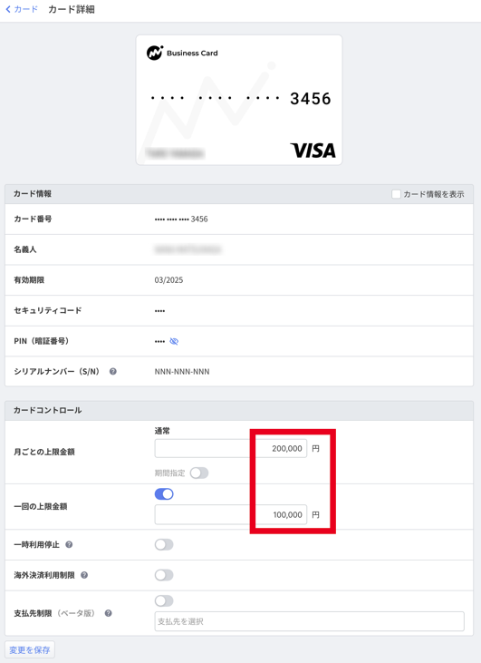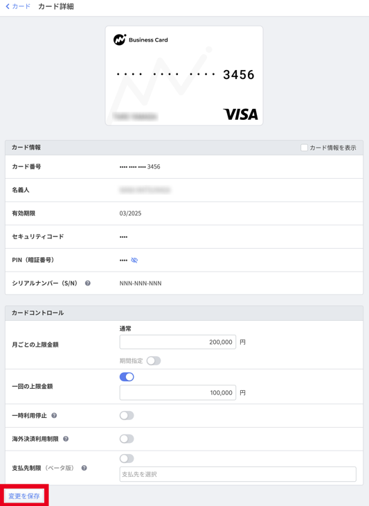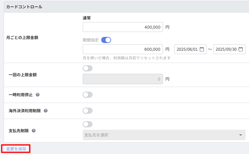 - 「カードコントロール」の「変更を保存」をクリックします。