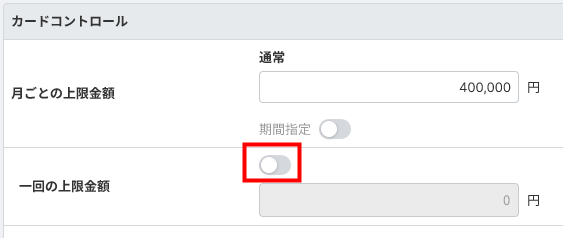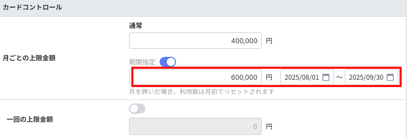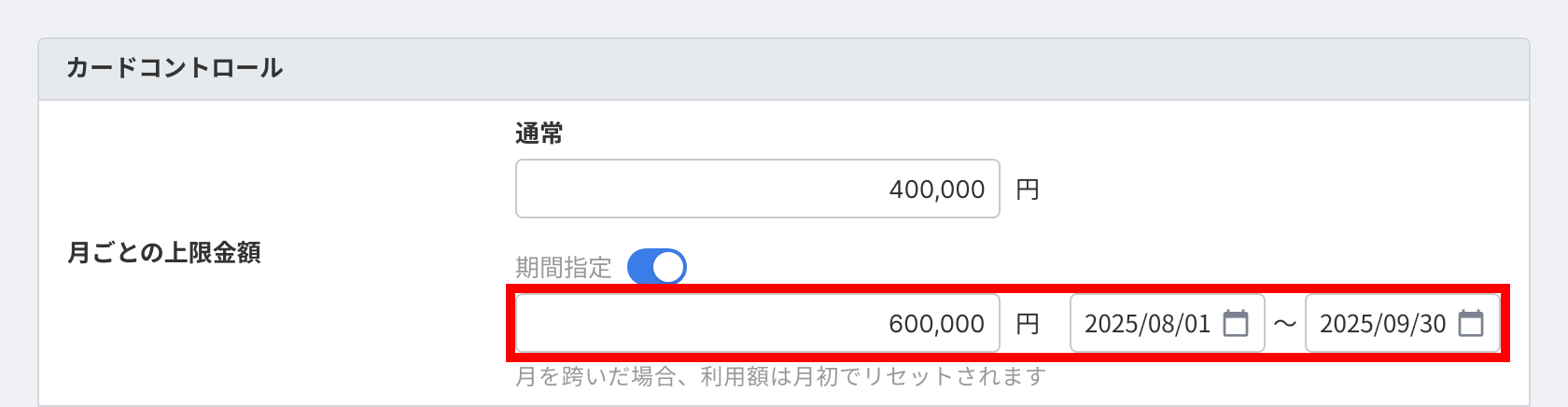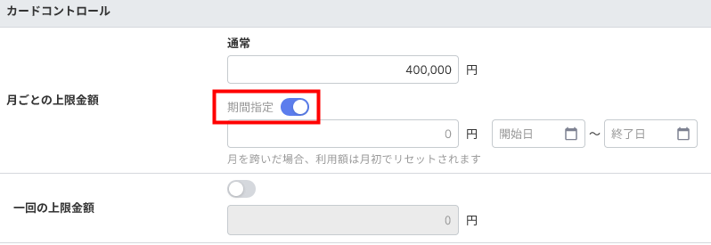 - 「カード詳細」画面の「カードコントロール」にある「月ごとの上限金額」で「期間指定」のスイッチを有効にします。