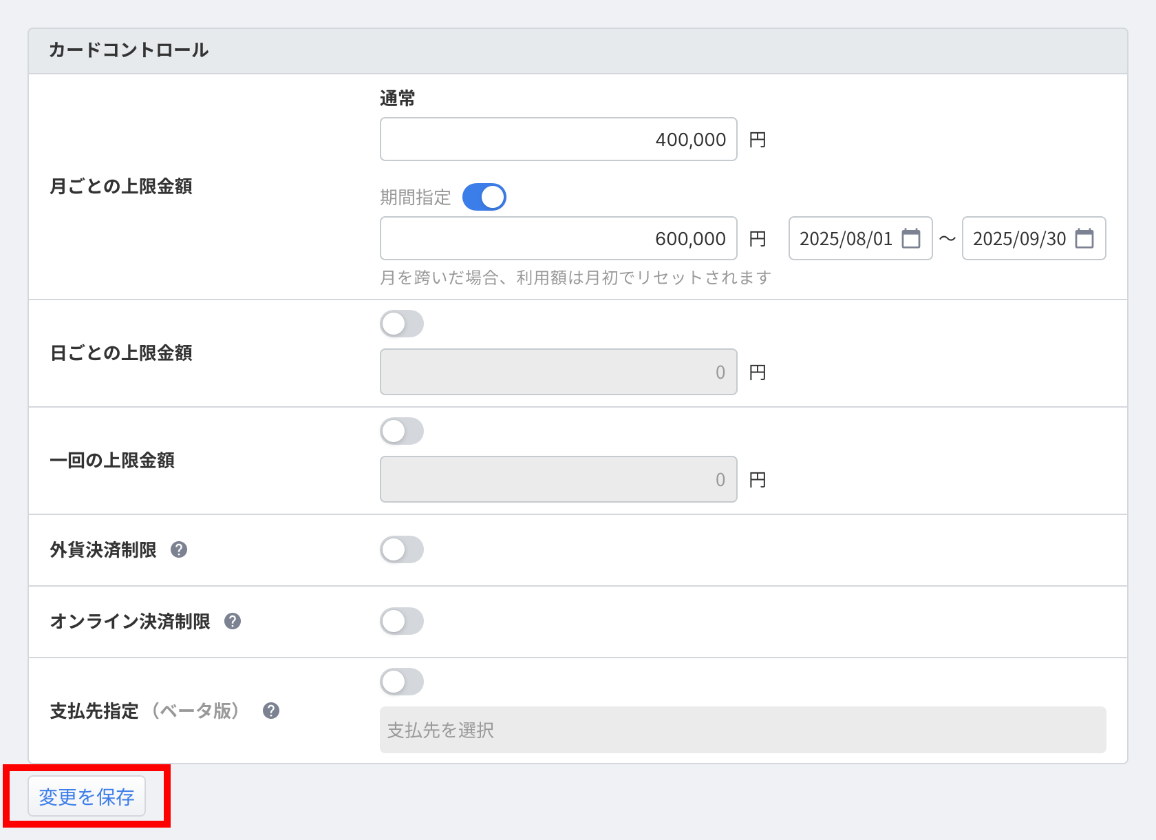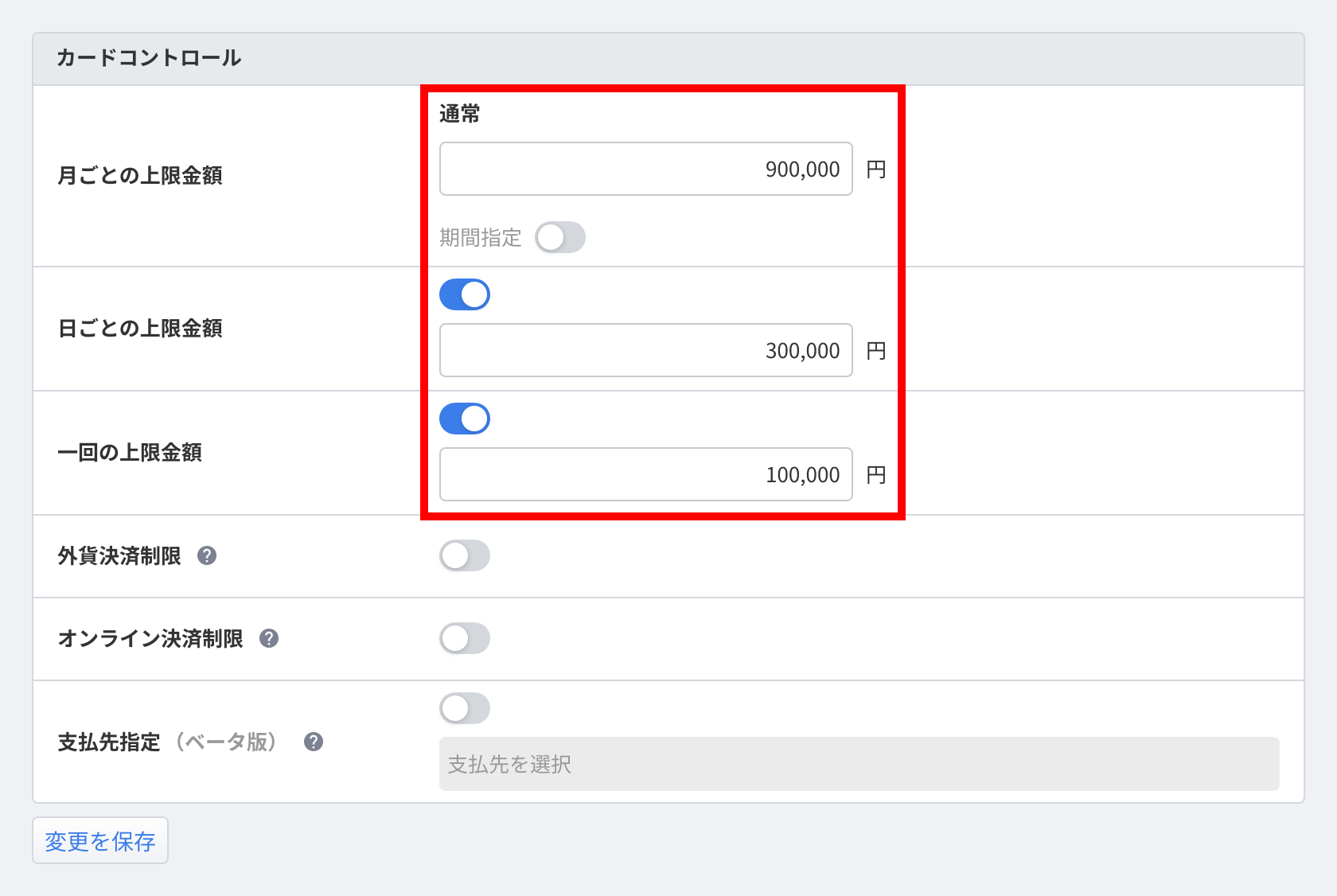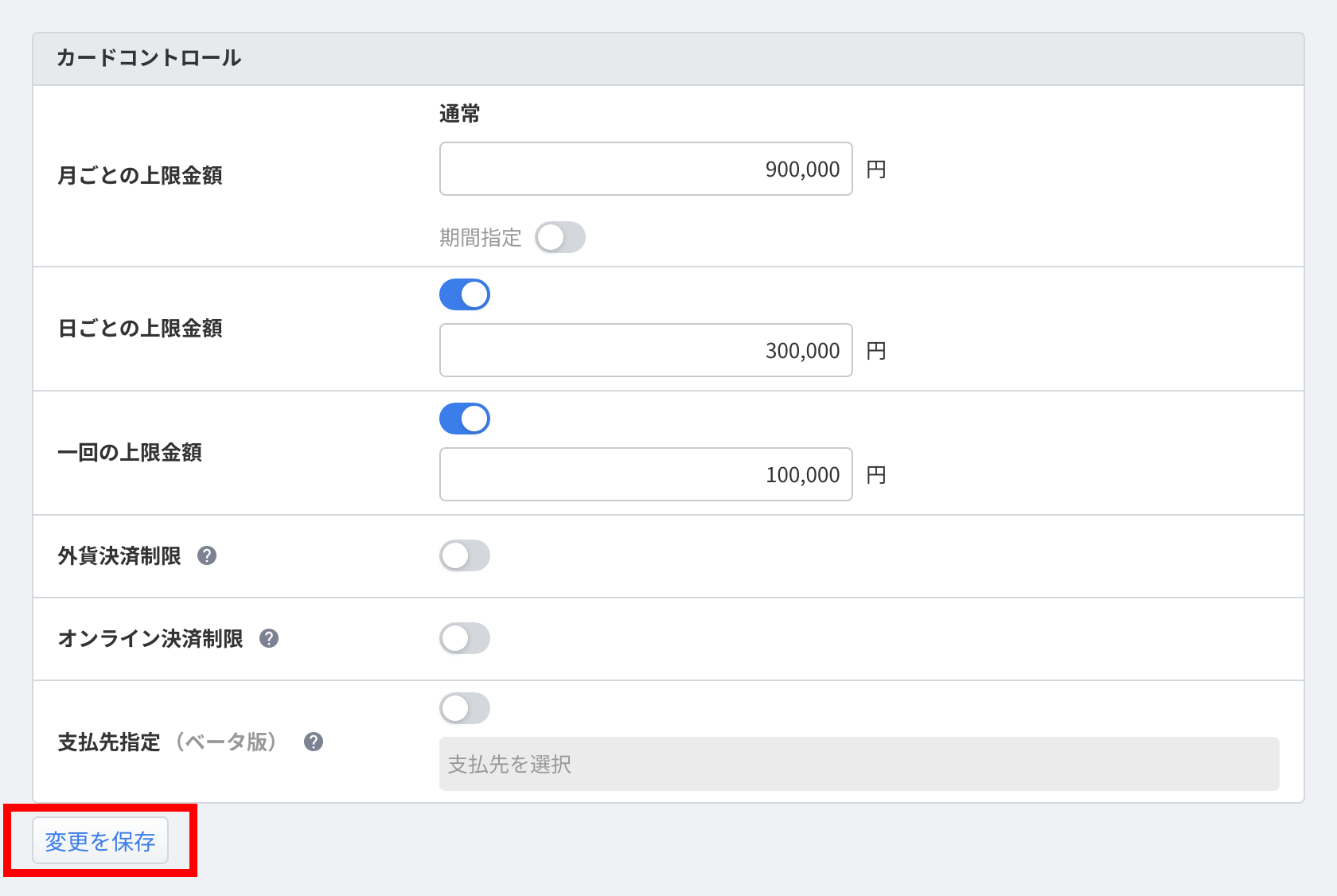 - 「カードコントロール」の下にある「変更を保存」をクリックします。