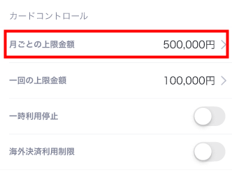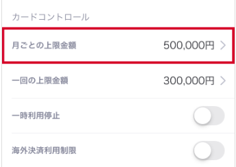 - 「カードコントロール」に表示されている「月ごとの上限金額」をタップします。
