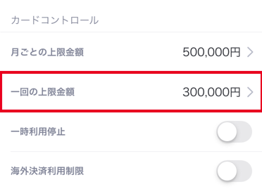 - 「カードコントロール」に表示されている「一回の上限金額」をタップします。