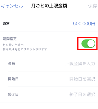 - 「月ごとの上限金額」画面で「期間指定」のスイッチを有効にします。