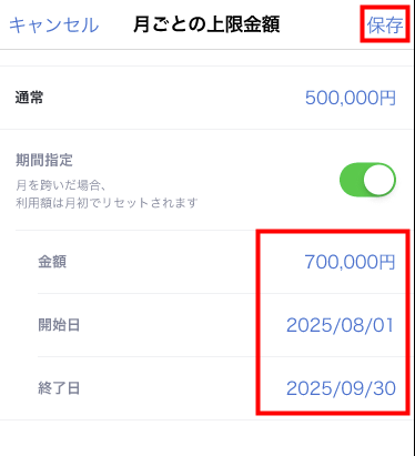 - 「金額」「開始日」「終了日」を指定し、「保存」をタップします。