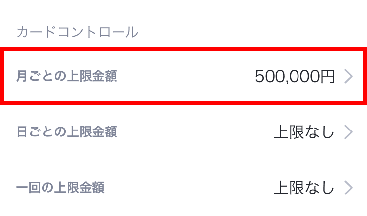 - 「カード詳細」画面の「カードコントロール」で「月ごとの上限金額」をタップします。