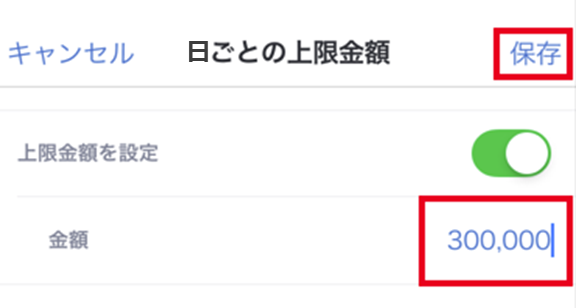 - 「日ごとの上限金額」画面で「上限金額を設定」のスイッチを有効にし、「金額」を入力して「保存」をタップします。