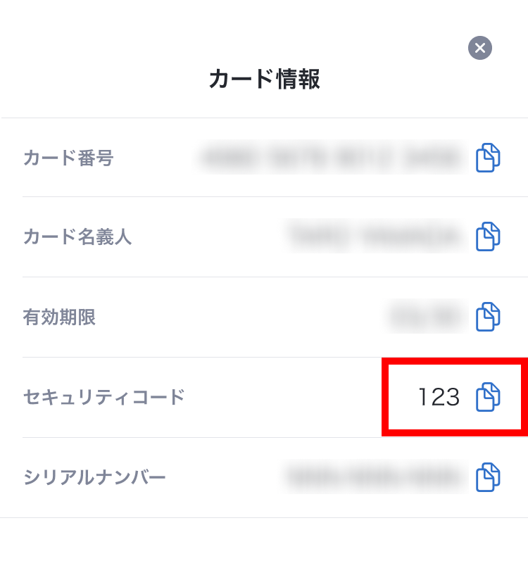- 「カード情報」画面で「セキュリティコード」を確認します。