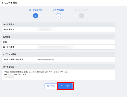 7. 「入力内容確認」画面で入力内容を確認し、問題がなければ「カード発行」をクリックします。