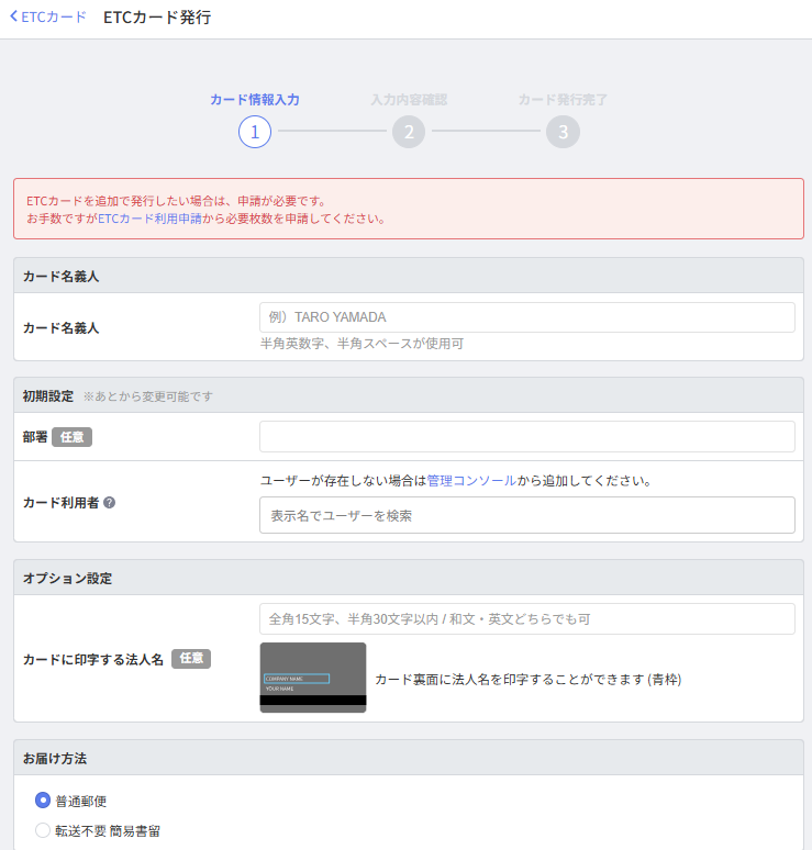 4. 「ETCカード発行」>「カード情報入力」画面で各項目を入力します。
