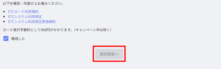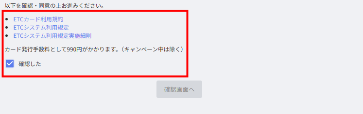 5. 画面下部で「ETCカード利用規約」「ETCシステム利用規定」「ETCシステム利用規定実施細則」と発行手数料を確認し、問題がなければ「確認した」にチェックを入れます。