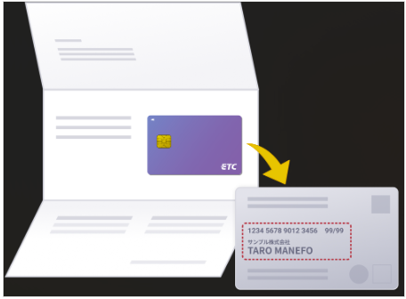 該当の封筒が届いたら、開封して台紙に貼付されているETCカードを剥がし、ETCカードの裏面に記載されている法人名(屋号)とカード名義人をご確認ください。