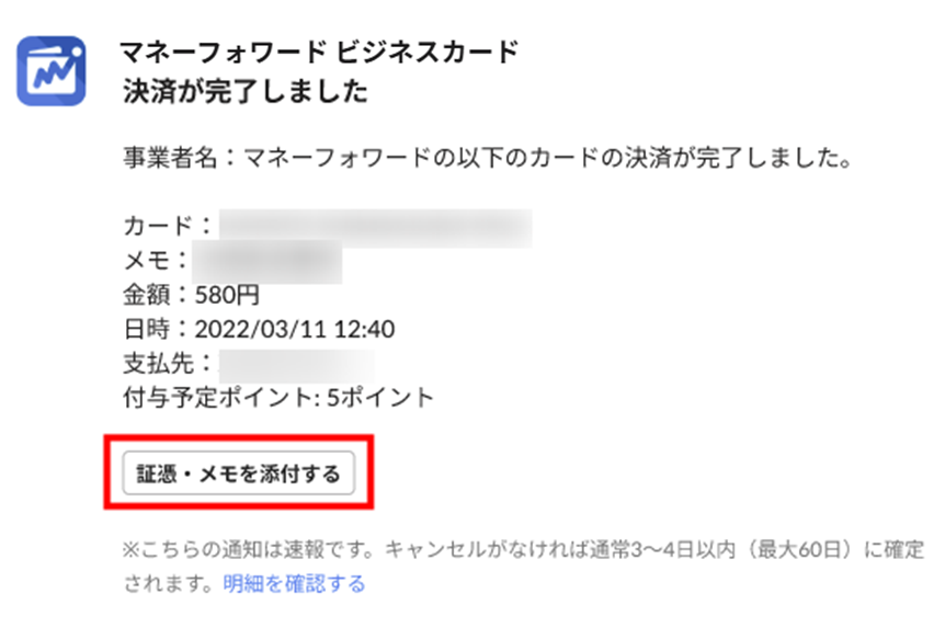 - 「Slack」で受信した決済完了通知を確認し、「証憑・メモを添付する」をクリックします。